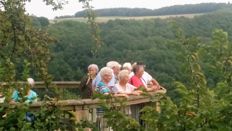 St. Johannisberg, ein kleiner Ortsteil der Nahegemeinde Hochstetten mit dem 2015 eröffneten „Sky – Walk“, einer Aussichtsplattform hoch über dem Nahetal, war unser heutiges Ausflugsziel. Über den Lützelsoon, mit Zwischenstop am Schloß Dhaun, einer kurzen Besichtigung des Schloßhofes mit herrlicher Ausicht auf das Kellenbachtal erreichten wir unser Ziel nach gut 1 ½ Stunden. Auf dem „Sky – Walk“ genossen wir wiederum die schöne Aussicht auf das Nahetal. Im Gasthaus „Landhaus“ St. Johannisberg, direkt am Sky – Walk, liessen wir es uns wie immer bei Kaffee und Kuchen so richtig gut gehen.